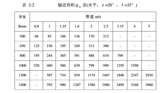 皮帶輸送機(jī)在設(shè)計(jì)當(dāng)中,首先要考慮到帶寬,除了輕型帶式輸送機(jī)之外,較常用的標(biāo)準(zhǔn)帶寬是500mm,650mm,1000mm,1200mm,1400mm,1600mm,1800mm,2000mm與2400mm。皮帶輸送機(jī)的帶寬由所運(yùn)送的物料最大塊度X和輸送機(jī)的輸送量Q 來(lái)共同確定。以下表2-1,表2-2是常用標(biāo)準(zhǔn)帶速V,帶寬B,小時(shí)輸送體積Q列在表中,即可根據(jù)小時(shí)輸送體積Q來(lái)進(jìn)行初估帶寬。