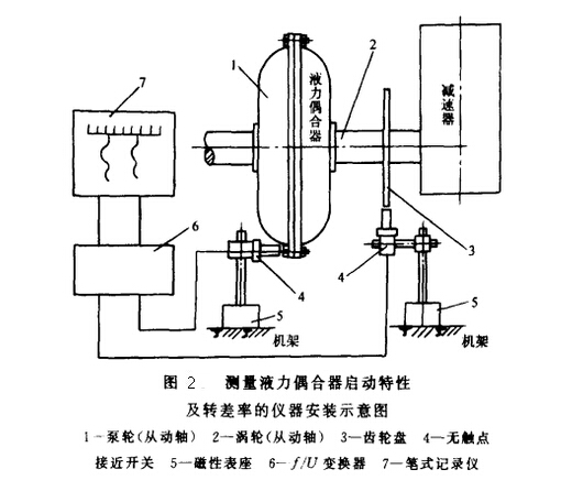 目前,大型帶式輸送機(jī)的驅(qū)動(dòng)均采用了液力偶合器,目的是為了節(jié)約能量,限制起動(dòng)力矩,改善起動(dòng)特性,保護(hù)膠帶。轉(zhuǎn)差率的測(cè)量方法如圖2是在渦輪從動(dòng)軸2上裝一個(gè)齒輪盤(pán)3,再用一個(gè)快速反應(yīng)的接近開(kāi)關(guān)4裝在磁性表座5上,磁性座吸附在機(jī)架上。當(dāng)接近開(kāi)關(guān)靠近齒輪盤(pán)時(shí),接近開(kāi)關(guān)受旋轉(zhuǎn)齒輪盤(pán)的影響產(chǎn)生一脈沖串 、轉(zhuǎn)速越高,脈沖頻率越高。再將脈沖頻率轉(zhuǎn)變成與之成正比的電壓,用一個(gè)筆試記錄儀記錄,就能測(cè)量液力偶合器從起動(dòng)開(kāi)始到穩(wěn)定運(yùn)行的速度變化過(guò)程。