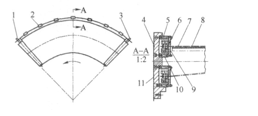 曲線導(dǎo)軌的設(shè)計比較復(fù)雜,由于許多圓弧線零件加工困難,在設(shè)計中從考慮工藝和結(jié)構(gòu)強度出發(fā),采用機件用螺栓連接組合的方式來形成外曲線上、下導(dǎo)軌。如圖1所示,外曲線上導(dǎo)軌由上弧板5、導(dǎo)向板6、下弧板10和導(dǎo)向板9組成,對輸送帶的承載面起導(dǎo)向作用,克服內(nèi)側(cè)偏移力,其中上、下弧板可采用等離子或線切割來完成,而導(dǎo)向板必須采用三輥機卷曲來滿足設(shè)計要求,從而保證精確導(dǎo)向。導(dǎo)向作用面要確保光滑,適當(dāng)時候可加注少量液體石蠟。與輸送錐輥中心線對稱的還有下導(dǎo)軌,其組成與上導(dǎo)軌基本相同,對輸送帶的懸垂面起導(dǎo)向作用,阻礙內(nèi)側(cè)移動。在設(shè)計時須考慮輸送承載面水平,輸送錐輥的中心線要與水平面呈一定角度。